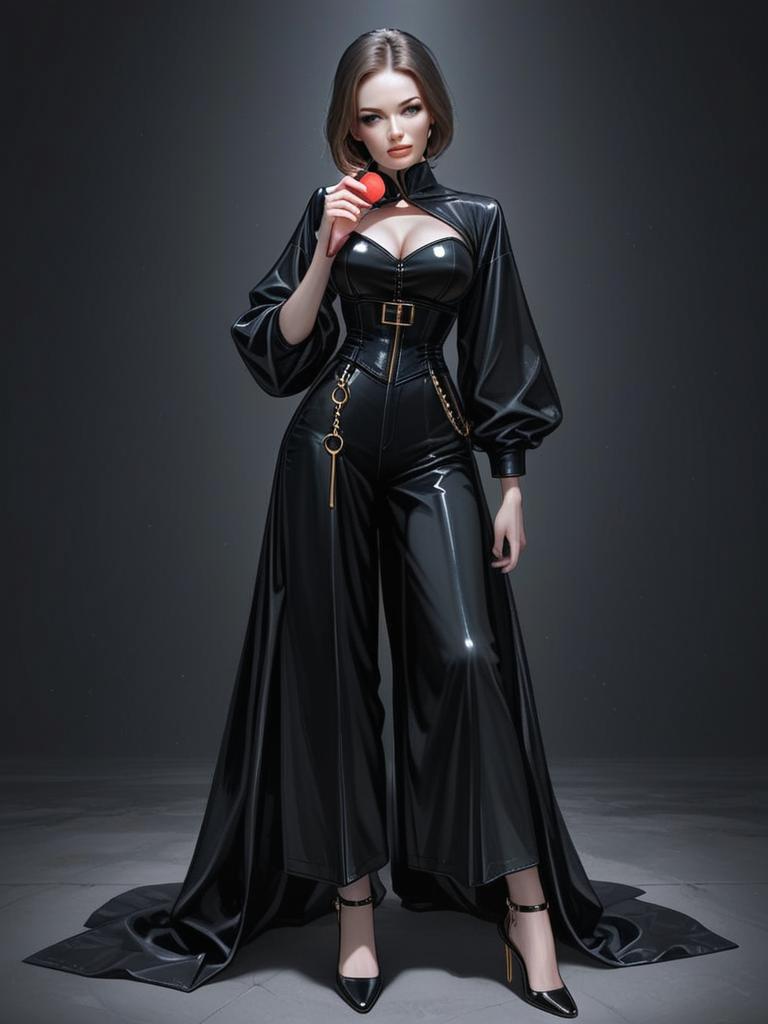 A striking woman poses confidently wearing a sleek black fashion jumpsuit crafted from glossy fabric that highlights its modern and edgy design. The outfit features dramatic batwing sleeves, a fitted corset waist with a gold buckle, and high-heeled black shoes, creating a bold, avant-garde style against a dark background.