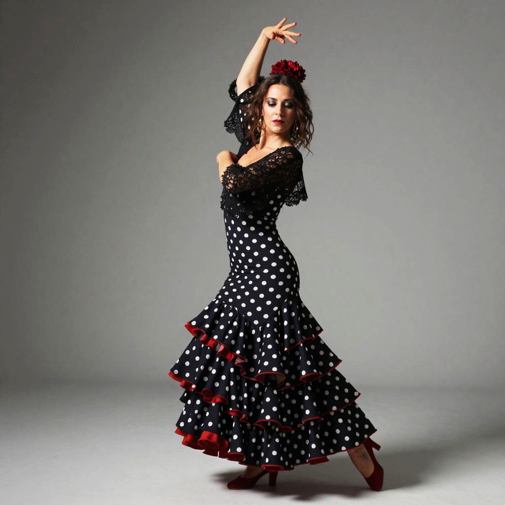 A woman elegantly performs a traditional Flamenco dance, dressed in a classic black dress adorned with white polka dots and vibrant red ruffles. Her poised stance, with one arm raised and a red flower in her hair, captures the passion and grace characteristic of Flamenco style.