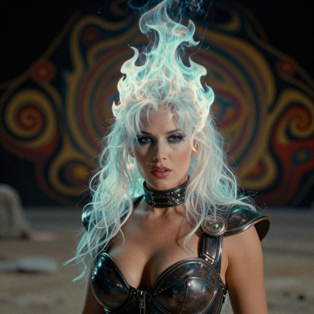 A fierce woman with platinum blonde hair styled to look like blue flames rises above her head, wearing a medieval-style metallic armor bodice with a studded leather choker. The background features vibrant, swirling patterns that contrast with her intense gaze, evoking a fantasy or warrior goddess theme.