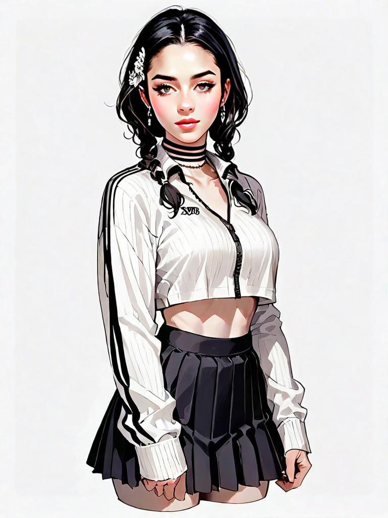 This digital artwork features a realistic-style illustration of a young woman with braided black hair, wearing a sporty white cropped jacket and a black pleated skirt. The character's detailed facial features and soft color palette enhance the modern comic-inspired aesthetic of the full-body portrait.