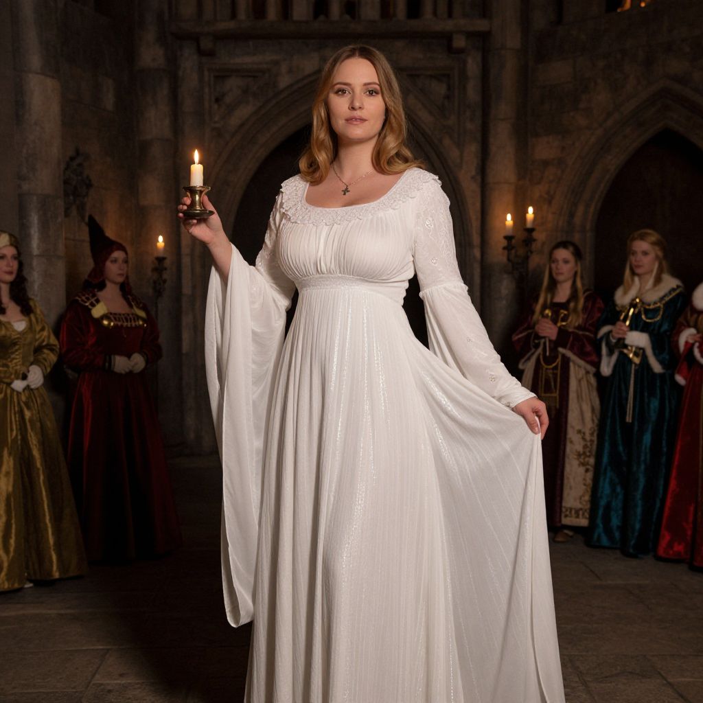 A woman dressed in a flowing white medieval-style gown holds a lit candle in a dimly lit stone chamber, evoking a serene and mystical atmosphere. Surrounded by other women in period costumes, the scene captures the essence of a historical or fantasy-themed gathering.