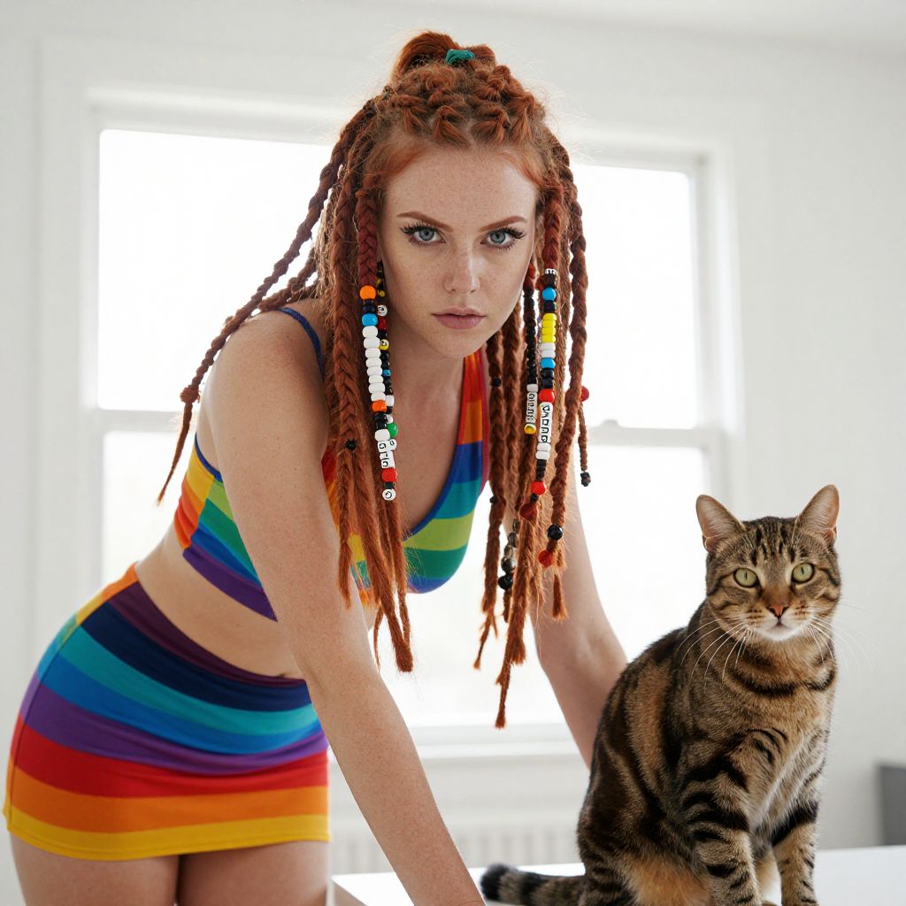 Red-Haired Woman in Rainbow Outfit with Beaded Braids and Tabby Cat Indoor