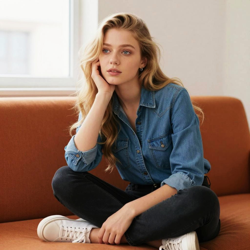 A young woman with blonde hair sits cross-legged on a brown sofa, wearing a casual denim shirt and black jeans paired with white sneakers. She has a thoughtful expression, resting her head on her hand, as natural light streams in through a nearby window. The image captures a relaxed and contemplative mood in a simple indoor setting.