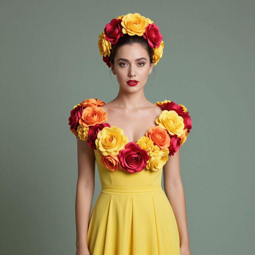 A woman poses gracefully against a muted green background, wearing a vibrant yellow dress adorned with large red, orange, and yellow floral appliques around the neckline and shoulders. Her matching floral headpiece and bold red lipstick complement the colorful, elegant look, presenting a modern and artistic fashion style.