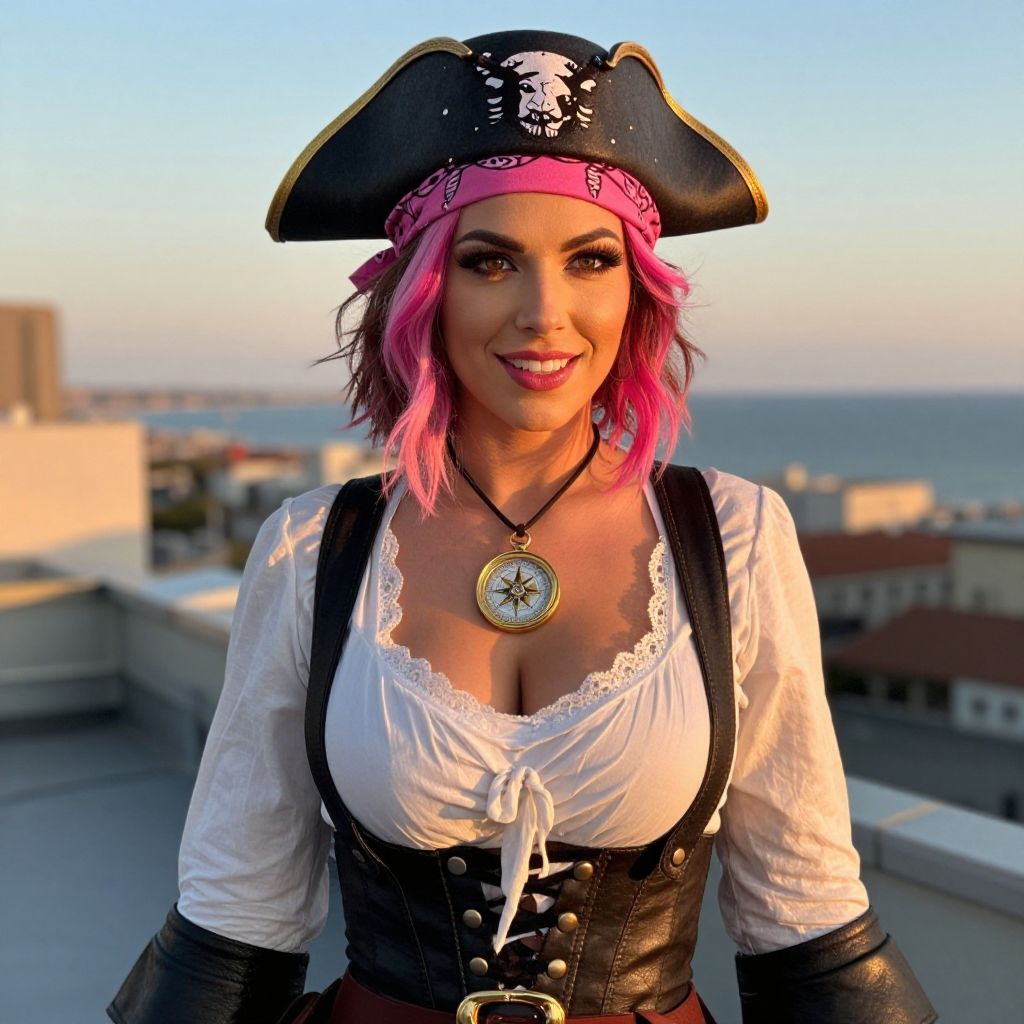 A confident woman dressed in a vibrant pirate costume stands outdoors with a serene ocean backdrop, captured in warm sunset lighting. She sports a black pirate hat with a skull emblem, a pink bandana, and a white lace-trimmed blouse paired with a black corset and a compass necklace, evoking a playful and adventurous spirit.