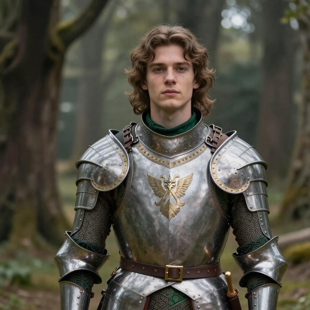 A young man dressed in intricately detailed medieval armor stands solemnly in a misty forest. The polished steel breastplate, adorned with a golden winged emblem, highlights the historical knightly style and craftsmanship. The natural woodland setting adds an ethereal, storybook quality to the portrait.
