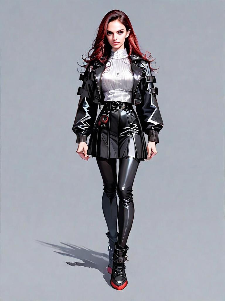 Edgy Woman in Black Leather Outfit Realistic Comic Style Full Body Illustration