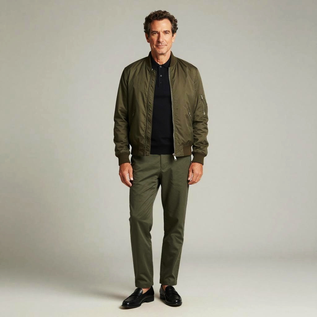 Man Wearing Olive Green Bomber Jacket and Trousers with Black Polo Shirt