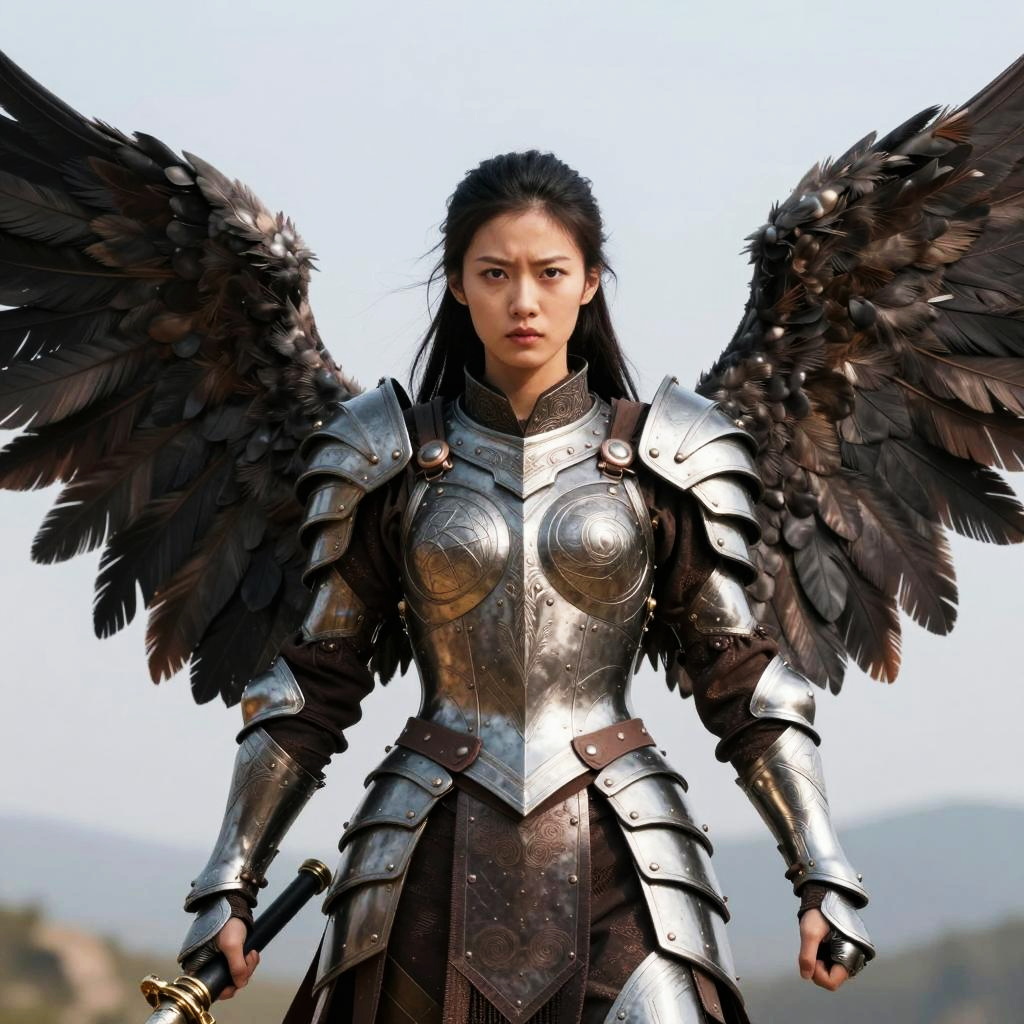 A determined woman clad in detailed medieval-style armor stands firmly while holding a sword, her imposing black feathered wings spread wide behind her. The image evokes a fantasy or epic warrior aesthetic, blending strength with mysticism in a powerful visual narrative.
