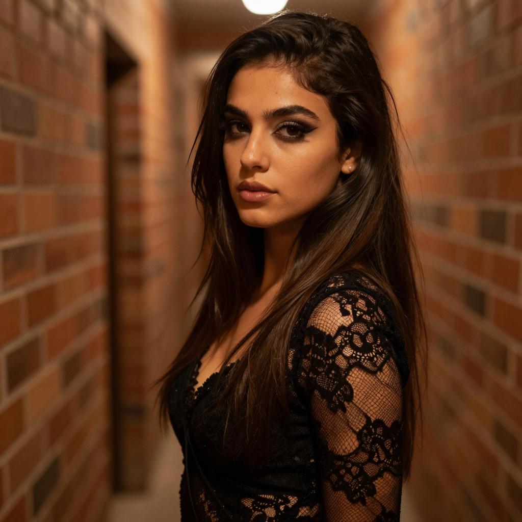 A young woman stands confidently in a narrow, warmly lit brick corridor, wearing a stylish black lace top. Her intense gaze and smoky eye makeup highlight a modern, edgy look that captures a quintessential Gen Z aesthetic.