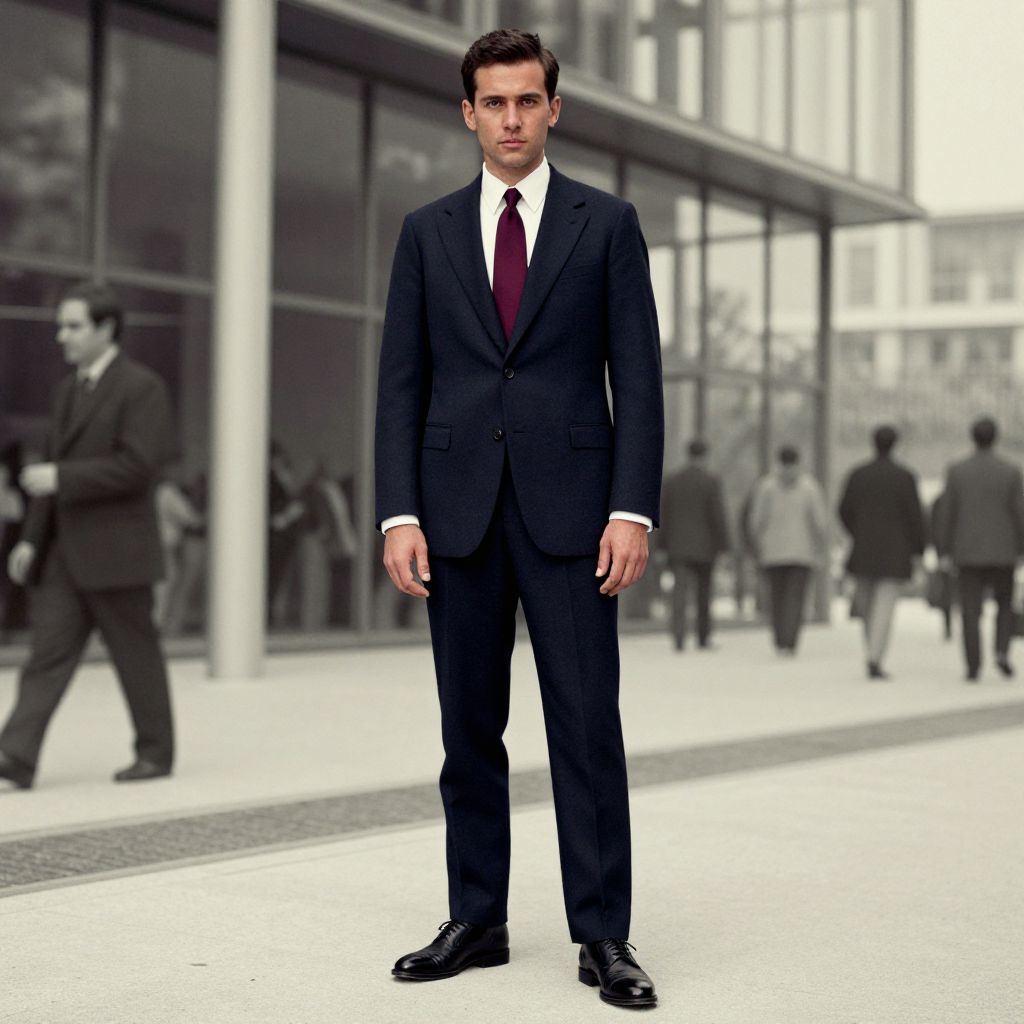 Young Man in Dark Navy Suit and Burgundy Tie Standing Outside Modern Office Building