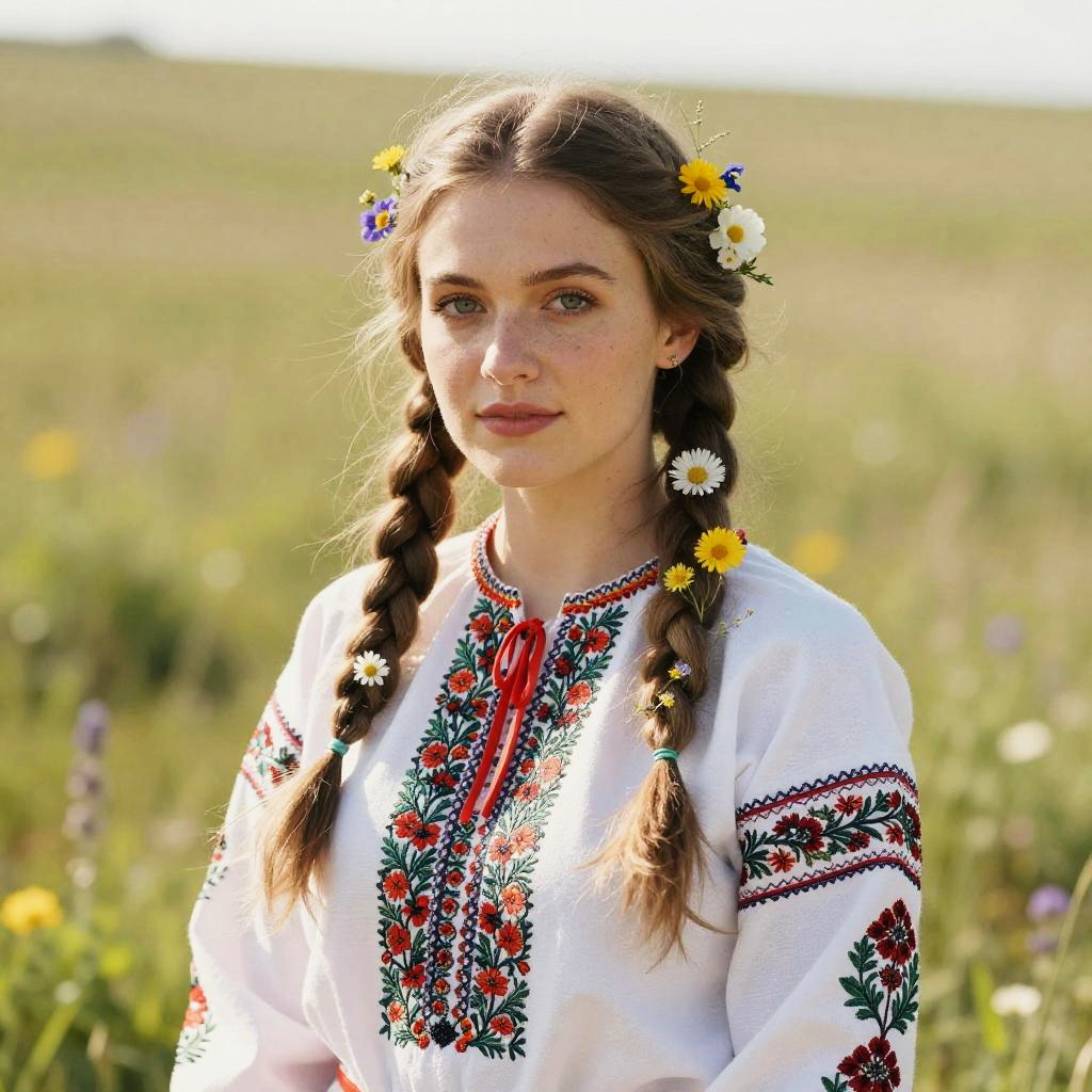 A young woman with braided hair adorned with colorful wildflowers is standing in a sunny field, wearing a traditional embroidered blouse with vibrant floral patterns. The serene, natural background complements her calm expression and folk-inspired attire, capturing an essence of rustic charm and cultural heritage.