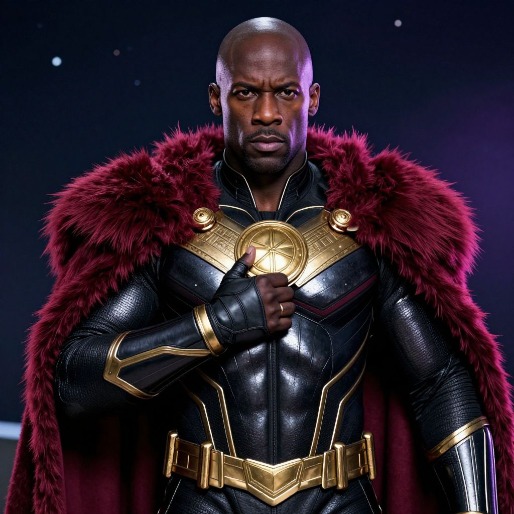 A powerful man dressed in a futuristic black and gold armored suit with a striking red fur cape stands confidently against a dark starry background. His intense expression and heroic posture suggest strength and authority, resembling a character from a sci-fi or superhero genre.