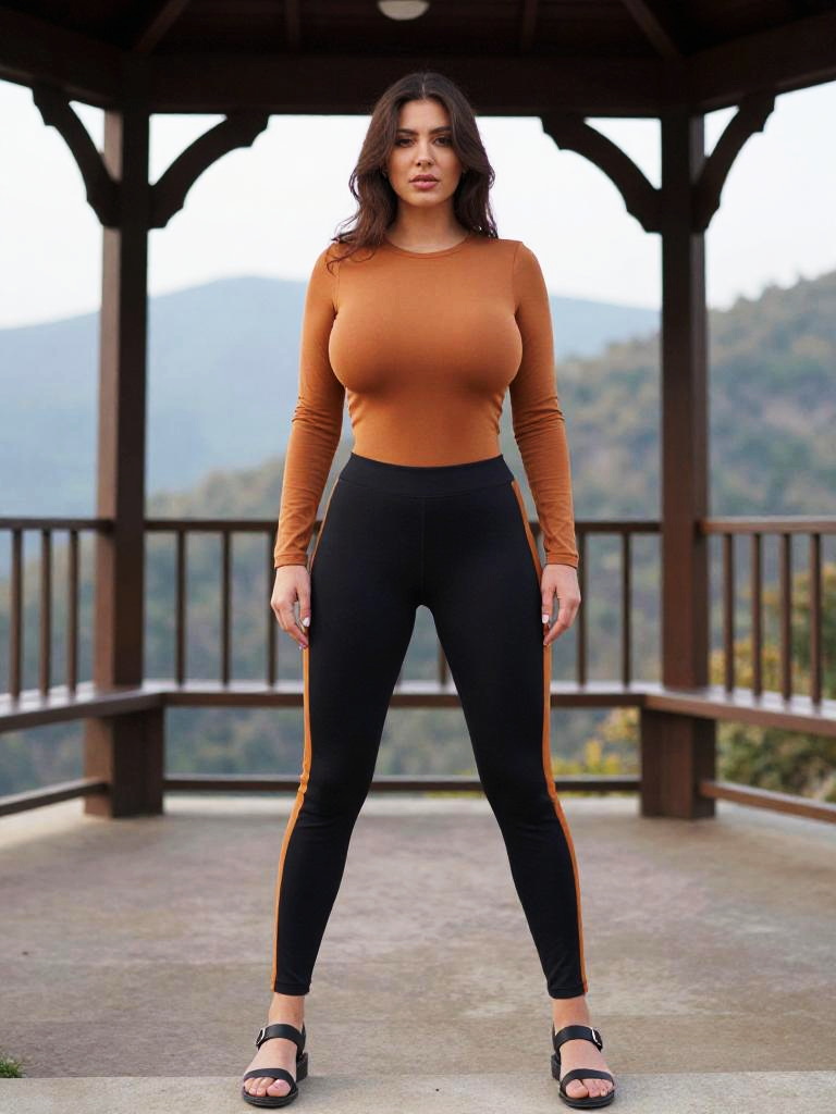A busty woman stands confidently in a casual street style outfit featuring a fitted long-sleeve top in warm brown and high-waisted black leggings with matching brown side stripes. The outdoor setting with a wooden gazebo and mountain backdrop enhances the natural and relaxed vibe of the ensemble.