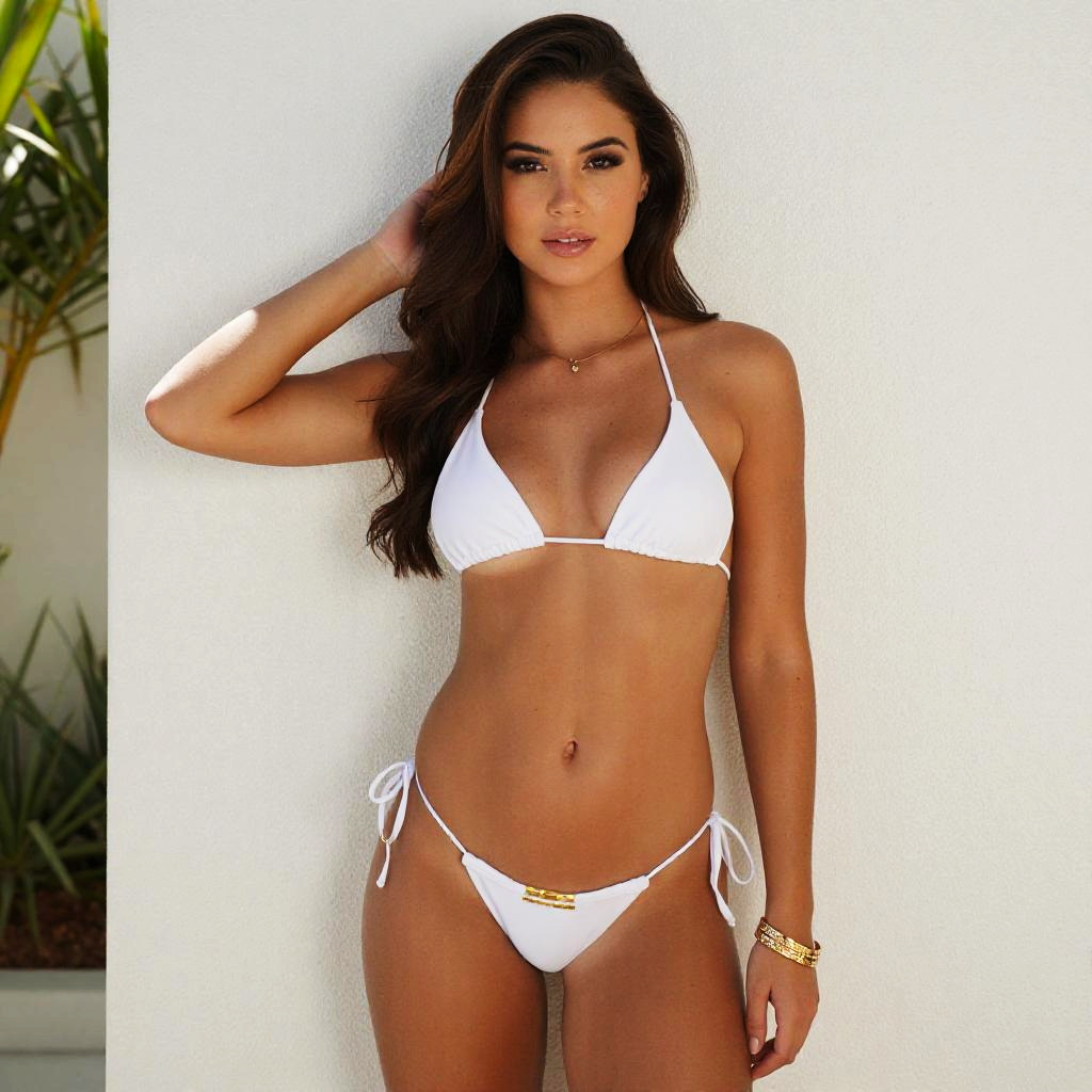A confident woman poses in a stylish white string bikini against a minimalist white wall backdrop with tropical greenery on the side. The image showcases a sun-kissed, summer-ready look with natural makeup and flowing dark hair, embodying modern beachwear elegance.
