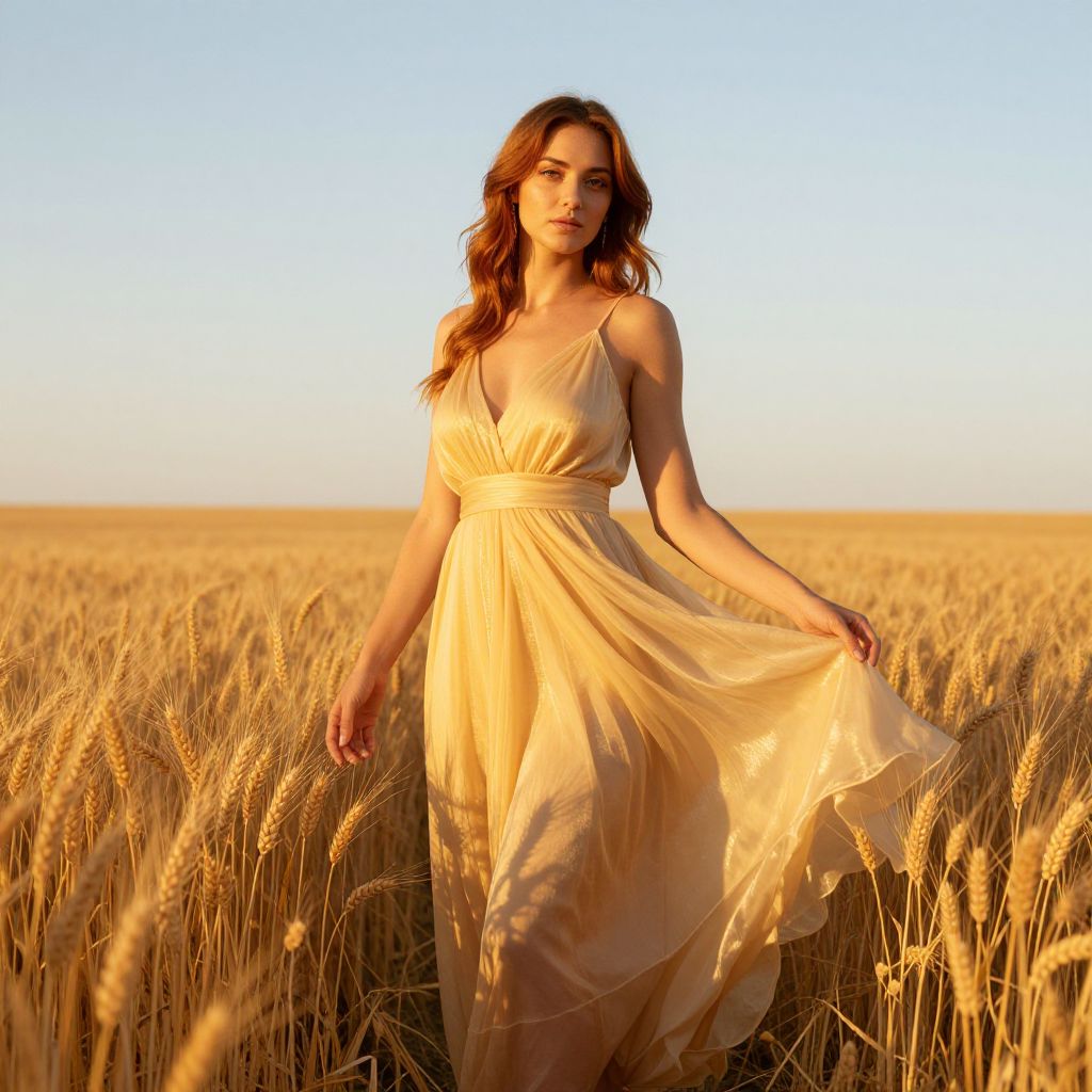 A woman in a flowing, light yellow dress stands gracefully in a golden wheat field during sunset. The warm natural light highlights her serene expression and the soft texture of her dress, capturing a peaceful and ethereal moment in nature.