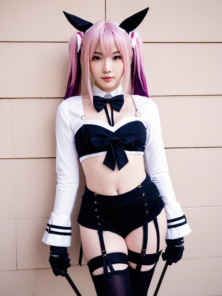 A woman cosplaying as Astolfo Saber from the Fate series poses confidently against a beige wall. She wears a black and white stylized outfit with bow accents, black gloves, and thigh-high stockings, complemented by pink and purple twin-tailed hair with black ear-like accessories, embodying the anime cosplay aesthetic.