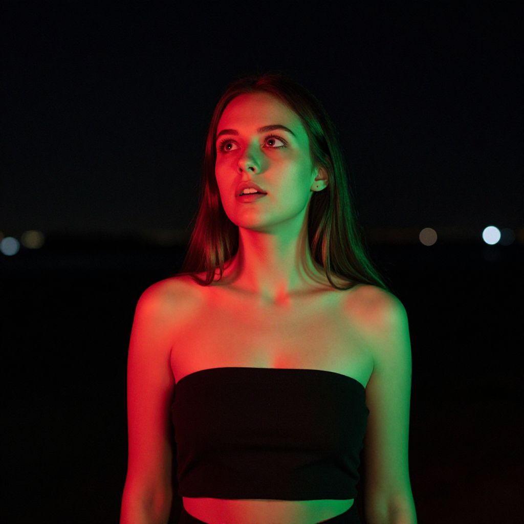 A young woman stands against a dark night background, illuminated by striking red and green lighting that creates a dramatic, atmospheric mood. She wears a black strapless top and gazes slightly upward with a contemplative expression, highlighting a modern, edgy portrait style.