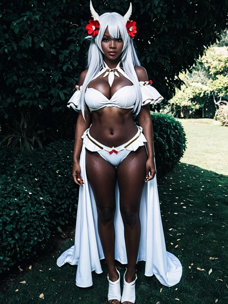 A woman dressed as Zooey from the game Granblue Fantasy poses outdoors against lush greenery. She wears an elaborate white costume with horned headpieces and red flower accents, reflecting the character's fantasy aesthetic. The image captures a realistic cosplay with careful attention to detailed costume design and natural lighting.