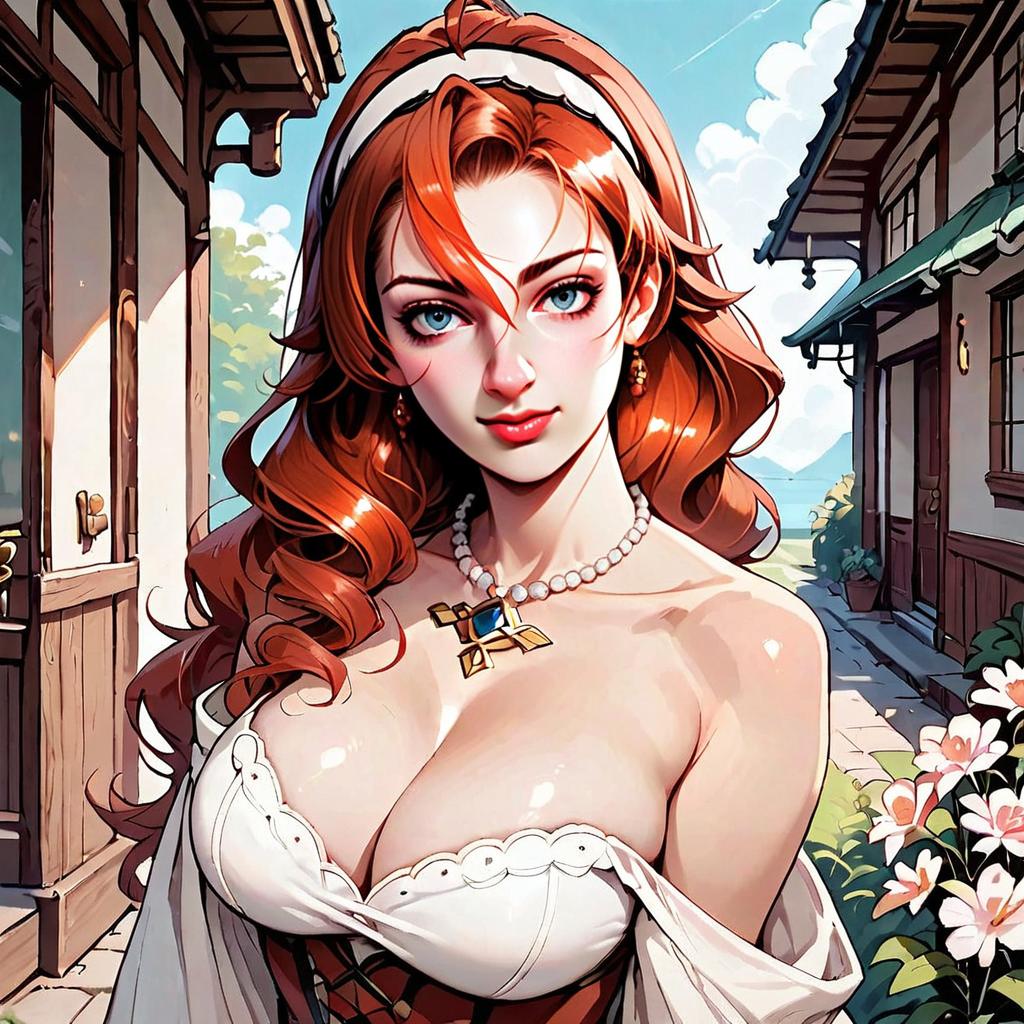 A digitally illustrated woman with long wavy red hair and bright blue eyes stands confidently in a charming outdoor setting featuring traditional wooden buildings and blooming flowers. She wears a white off-shoulder dress with intricate lace details and a pearl necklace adorned with a striking blue gem, rendered in a vibrant anime style with high detail and rich colors.