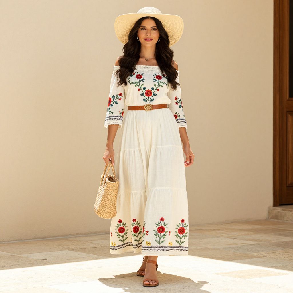 A stylish woman walks confidently wearing a white off-shoulder maxi dress adorned with vibrant floral embroidery. She accessorizes her look with a wide-brimmed straw hat, a tan belt, a woven handbag, and brown sandals, perfect for a sunny, elegant summer day.