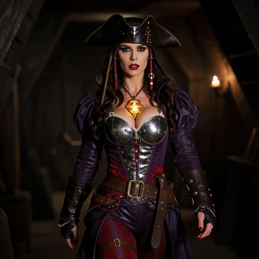 Confident Pirate Woman Costume with Glowing Pendant