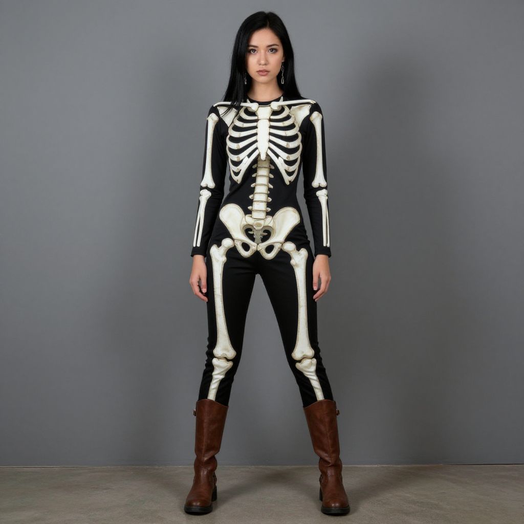 A woman stands confidently against a gray backdrop, wearing a black skeleton costume that vividly displays white bone structures from head to toe. She pairs the outfit with brown boots, creating a striking contrast that emphasizes the Halloween or costume party theme.