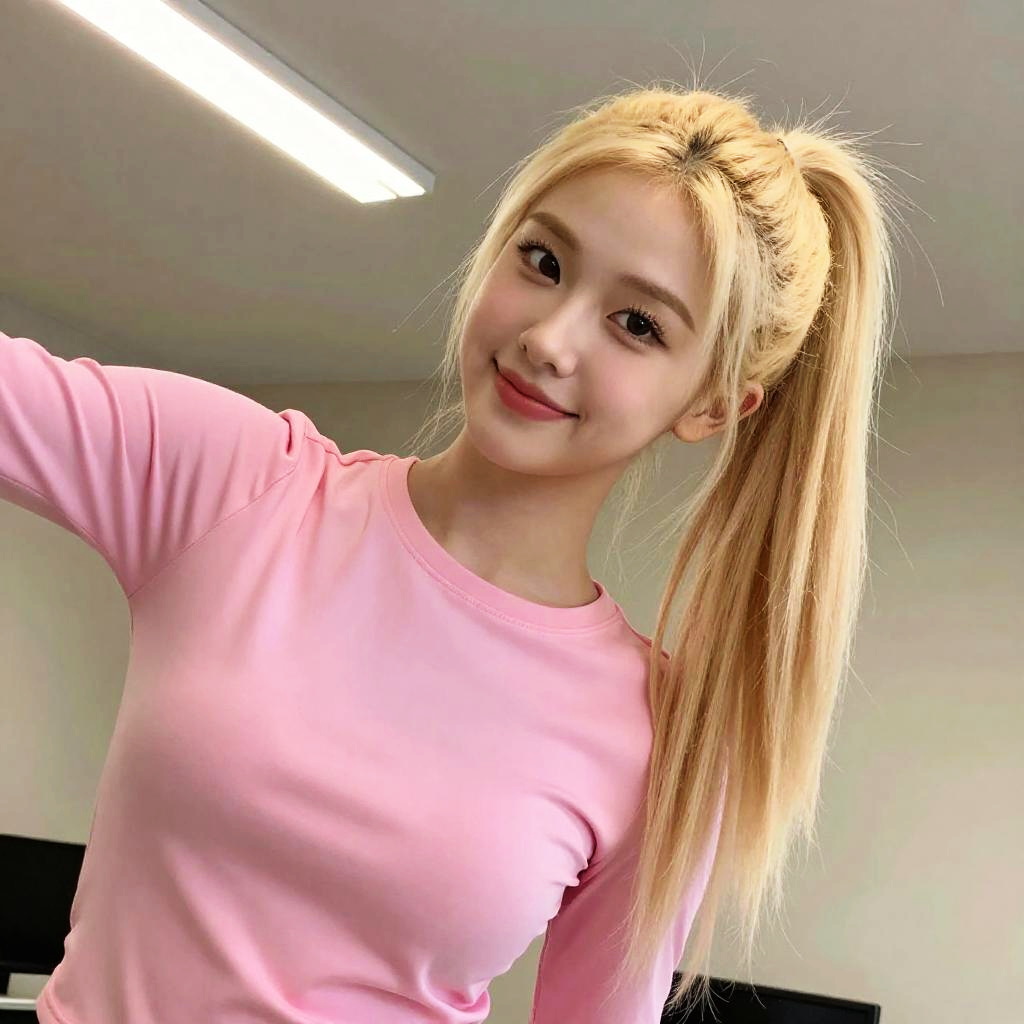 A young woman with long blonde hair tied in a high ponytail is smiling softly, dressed in a fitted pink shirt. She is indoors with a simple, neutral background that highlights her bright and cheerful expression.