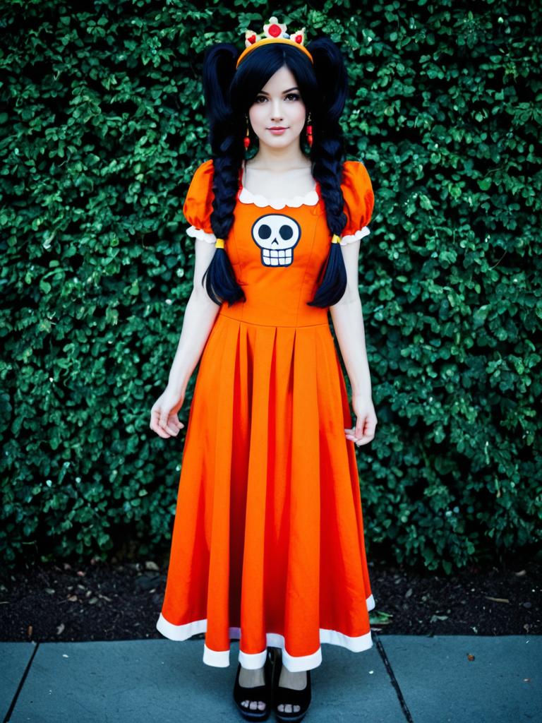 A woman stands confidently against a lush green hedge, dressed in a vibrant orange princess-style dress adorned with a bold skull emblem on the chest. Her high-puffed sleeves, long braided black hair, and crown add a whimsical, cosplay-inspired charm to the image, creating a striking contrast between the playful outfit and the natural backdrop.
