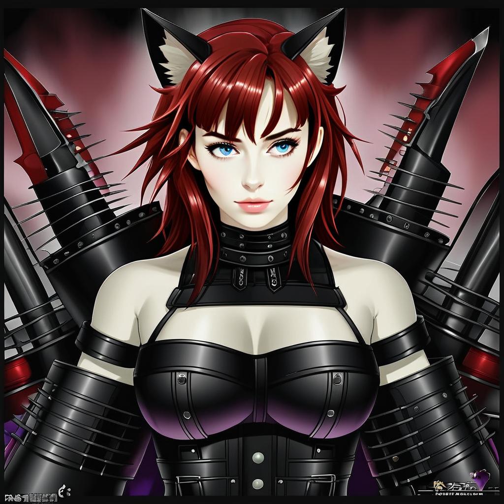 This digital anime-style artwork features a fierce woman with vibrant red hair and striking blue eyes, adorned with cat ears that emphasize a fantasy theme. She is dressed in a detailed black leather outfit with metal accents, exuding a strong and commanding presence, complemented by sharp, mechanical weaponry in the background.