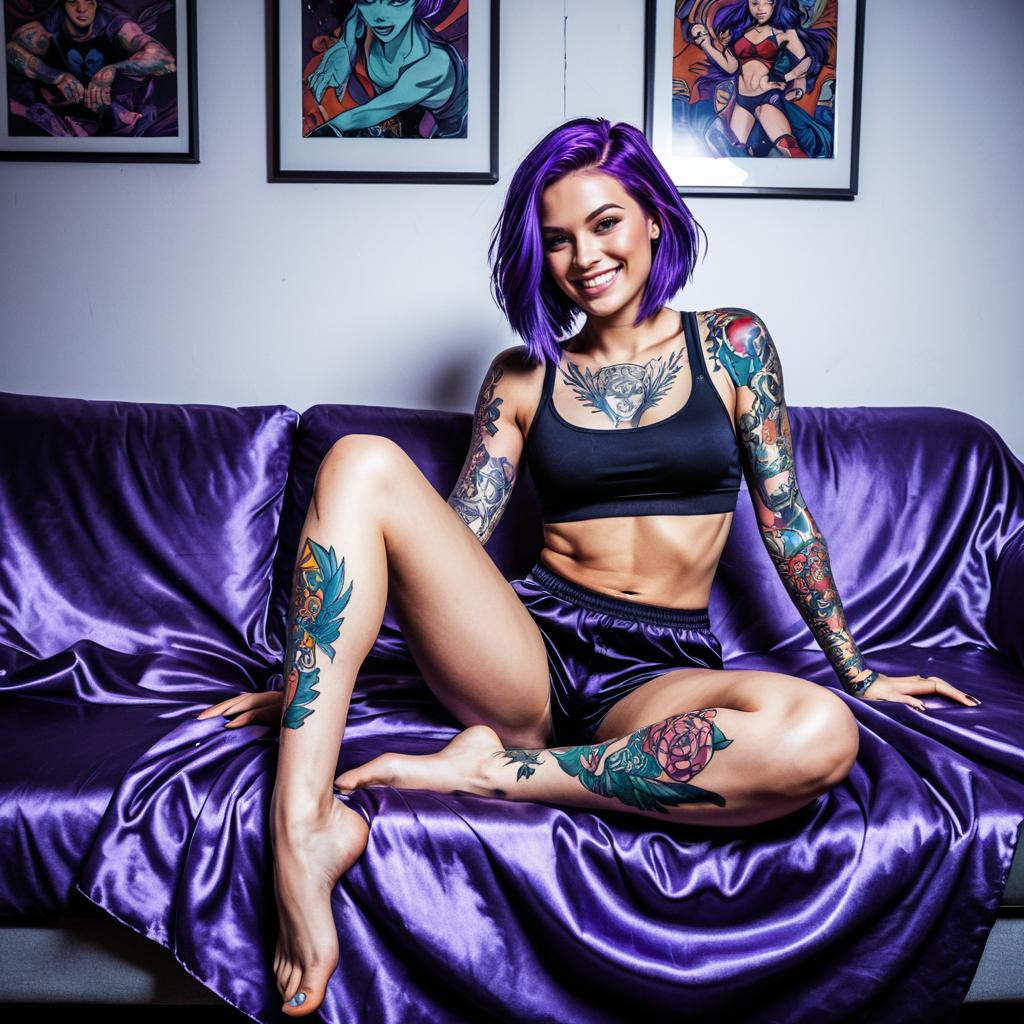 A confident woman with vibrant purple hair and extensive colorful tattoos poses on a purple satin-covered couch, wearing a black sports bra and matching shorts. The setting is artistic and modern, with framed illustrations of stylized characters adorning the wall behind her, complementing her edgy and vivid look.