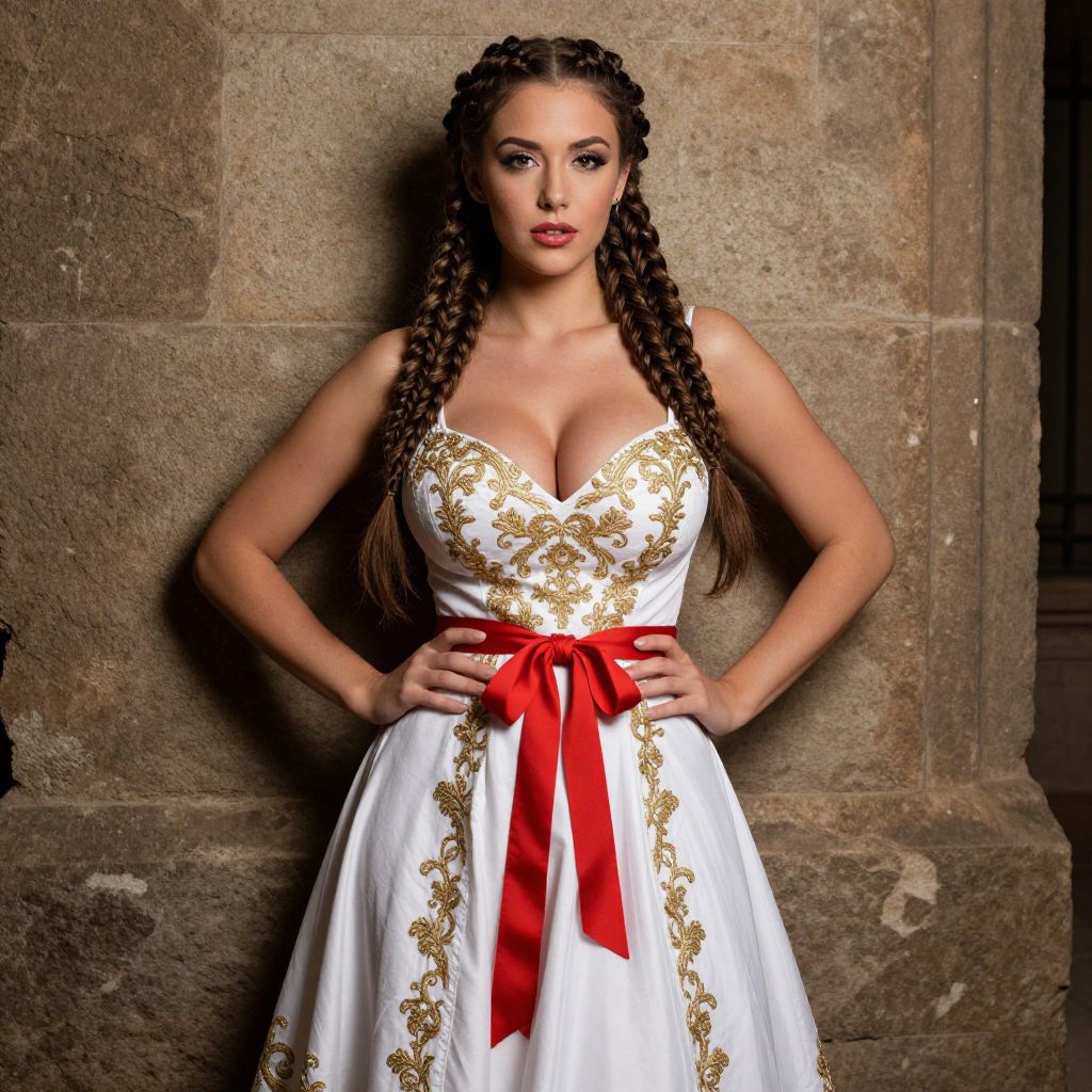 A confident woman stands against a textured stone wall, wearing an elegant white dress adorned with intricate gold embroidery and a bold red sash tied around her waist. Her long hair is styled in thick braids, complementing the classic and regal aesthetic of the setting and attire.