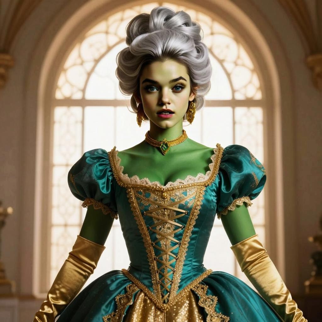 A striking portrait of a woman with green skin dressed in an elaborate 18th-century style gown featuring rich teal and gold detailing. Her hair is styled in a high, powdered wig, and she wears elegant gold gloves and jewelry, blending historical fashion with fantasy elements.