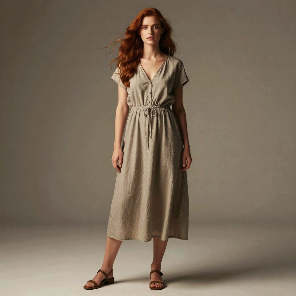 A confident woman with flowing red hair stands against a neutral backdrop wearing a simple, yet elegant beige midi dress with a drawstring waist and short sleeves. The minimalist styling, coupled with natural lighting, highlights the timeless casual fashion suitable for Gen Z trends.