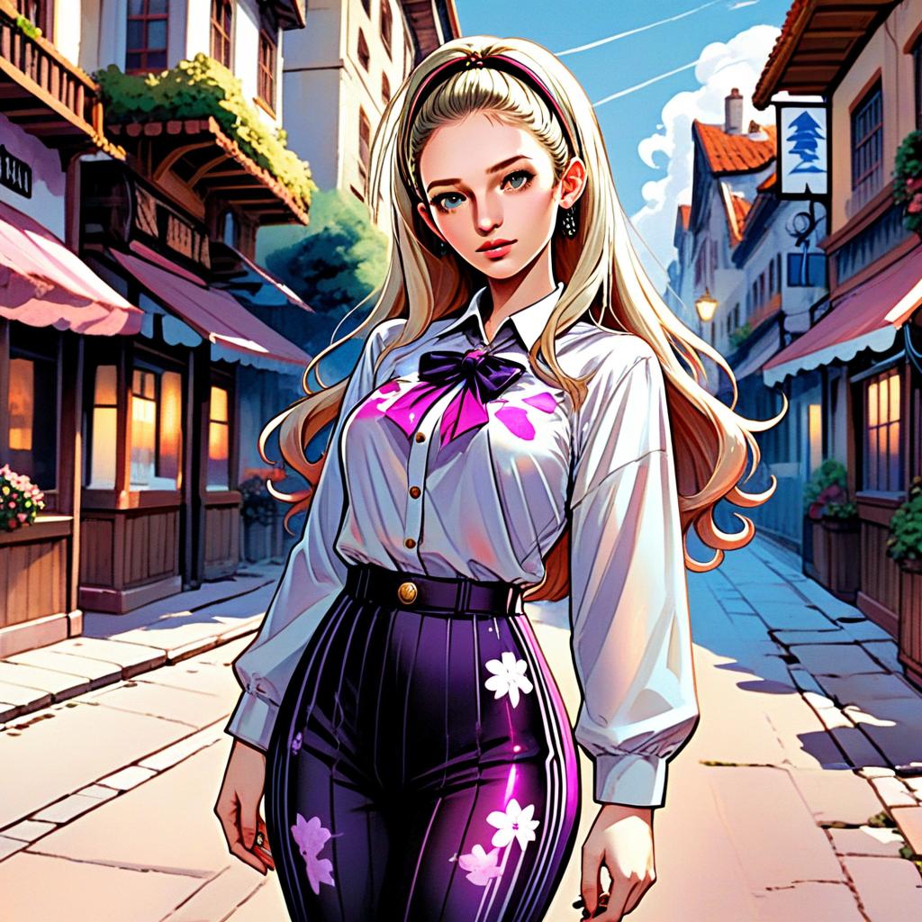 A stylish young woman with long blonde hair stands confidently in a charming, sunlit European street. She wears a white blouse with a purple bow and high-waisted pants adorned with floral patterns, blending modern fashion with a vibrant, anime-inspired art style. The background features quaint buildings and soft daylight, adding a picturesque atmosphere.
