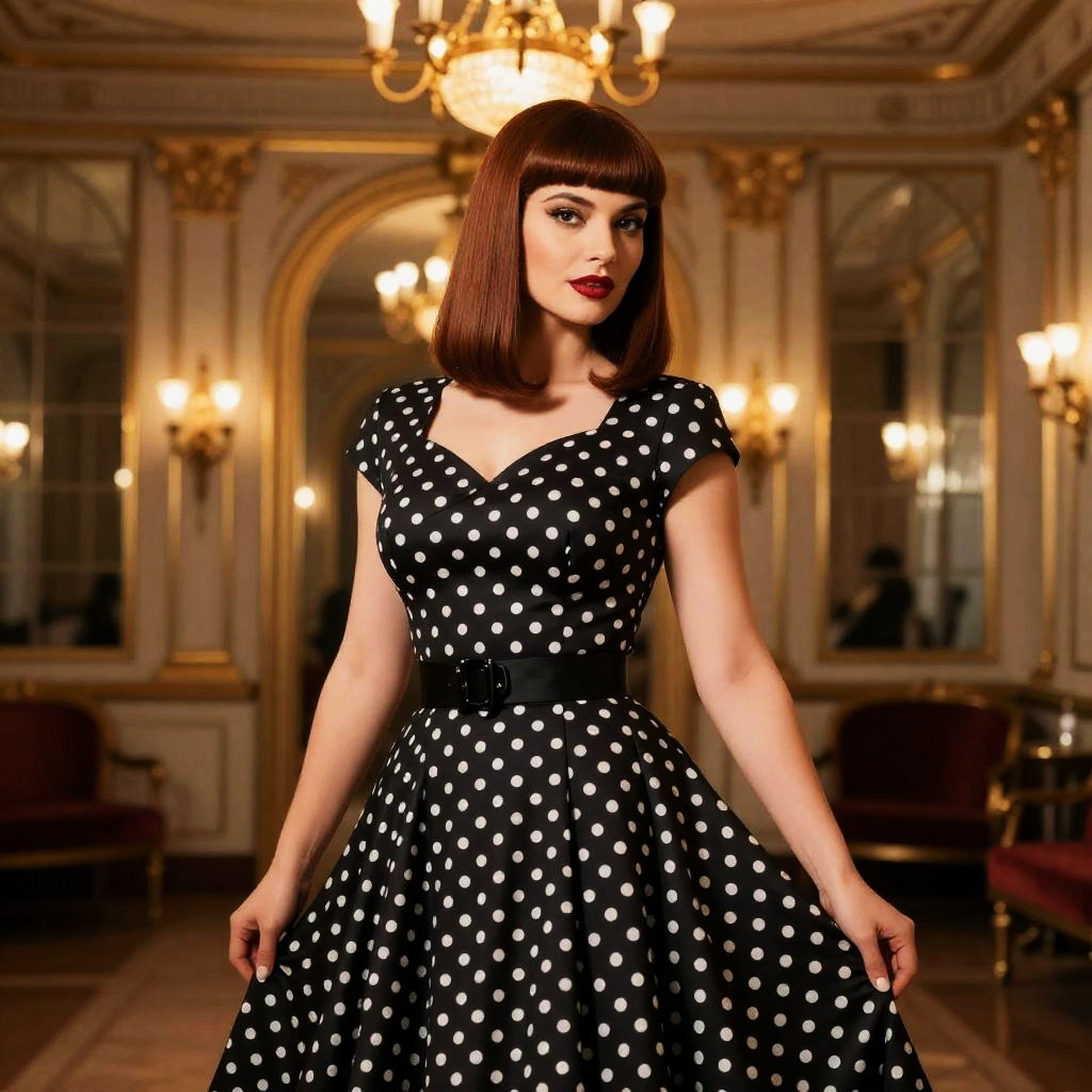 A stylish woman with sleek auburn hair and bold red lipstick showcases a classic black dress with white polka dots and a belted waist in an opulent vintage setting. The elegant interior, featuring ornate gilded mirrors and soft chandeliers, complements her glamorous retro 1950s-inspired look.
