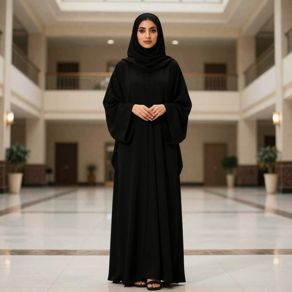 A woman dressed in a traditional black abaya stands confidently in a spacious, well-lit building with marble floors and a high ceiling. The elegant setting highlights the modest and graceful style of the abaya, reflecting cultural and fashionable elements.