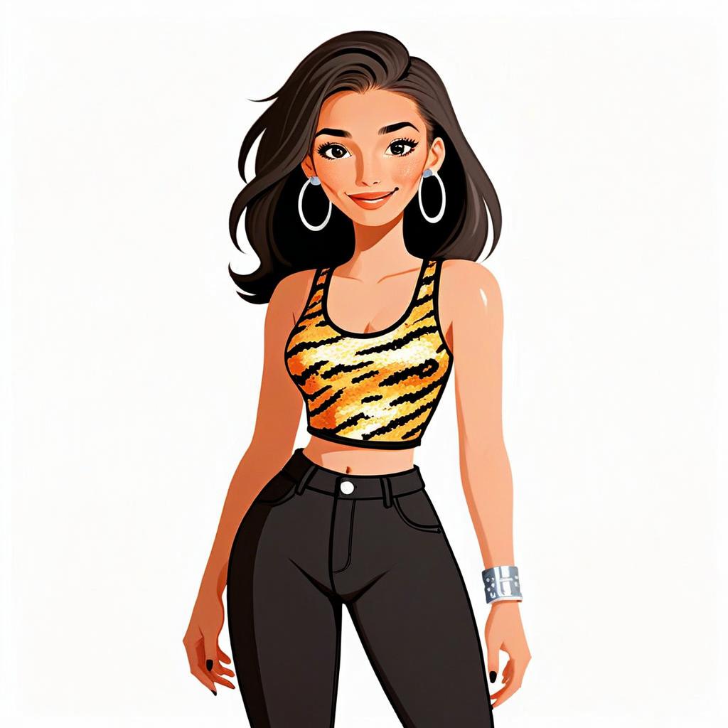 This vibrant digital illustration features a woman with a pretty face and flowing dark hair, confidently smiling. She wears a glamorous rock-style sleeveless crop top with a dynamic striped pattern, paired with high-waisted black pants and statement accessories, highlighting a modern, stylish aesthetic.