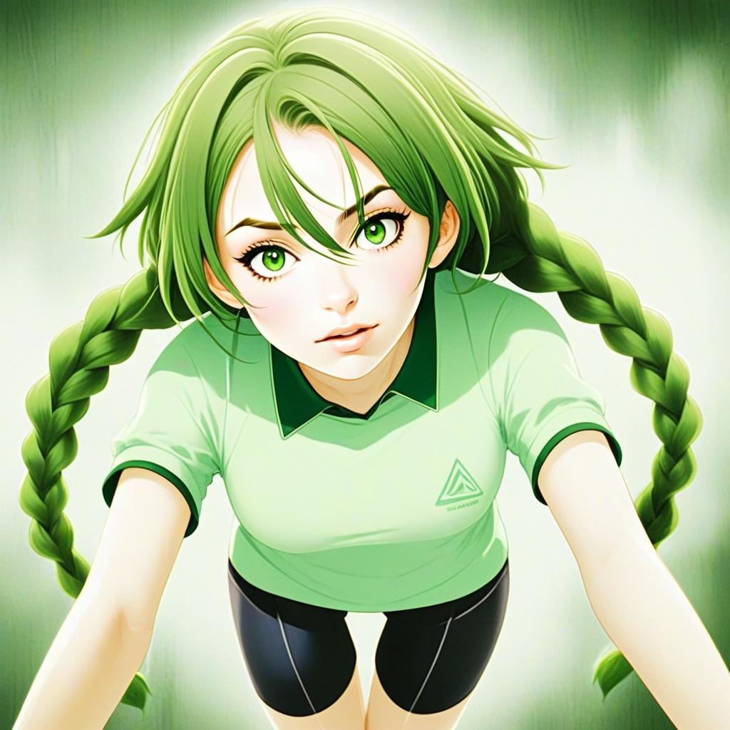 This vibrant anime-style illustration features a young woman with striking green hair styled in two long braids and bright green eyes. She wears a light green sports polo and black cycling shorts, looking up with an engaging and energetic expression, rendered with sharp details and vivid colors typical of contemporary digital anime art.