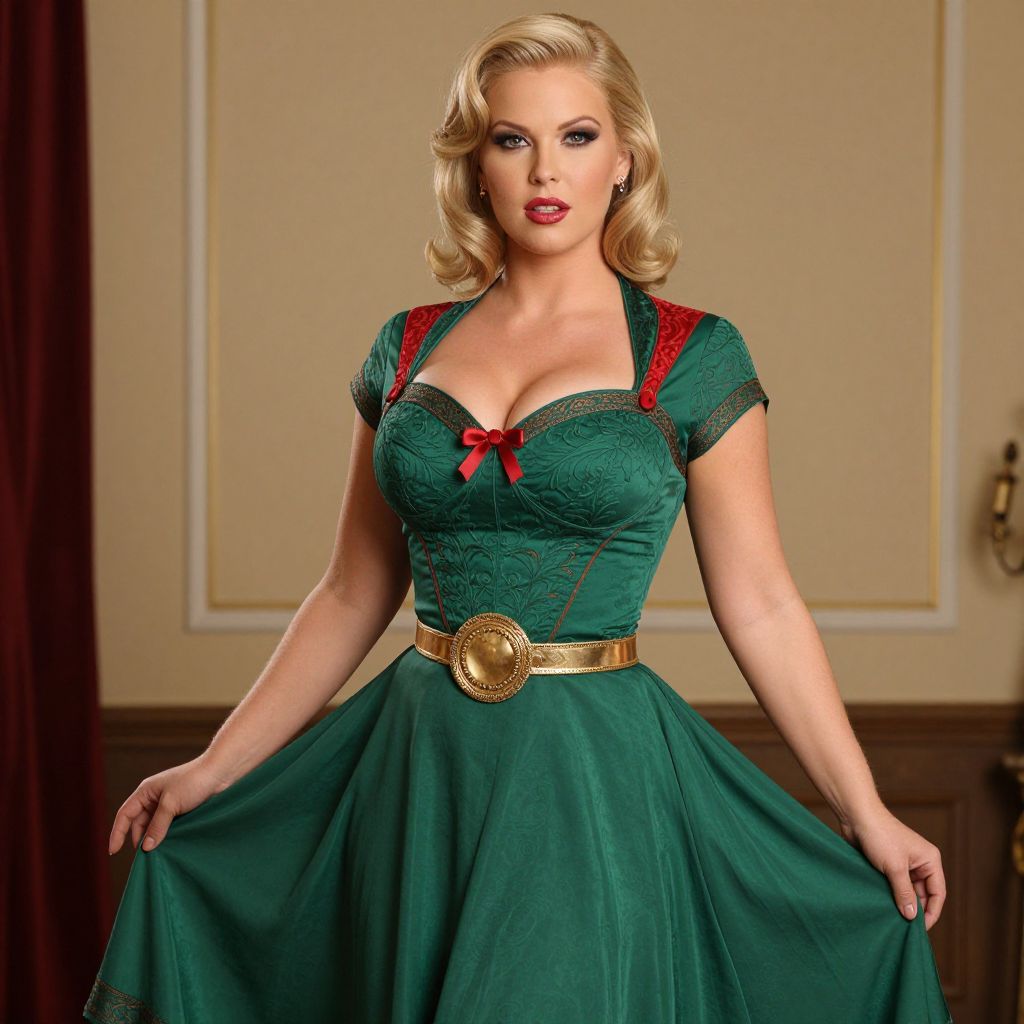 A glamorous woman poses elegantly wearing a vintage-style green dress with a fitted bodice featuring intricate patterns and a red bow accent. The dress has a full skirt and gold belt, complementing the classic Hollywood waves hairstyle and sophisticated makeup, creating a timeless retro look.