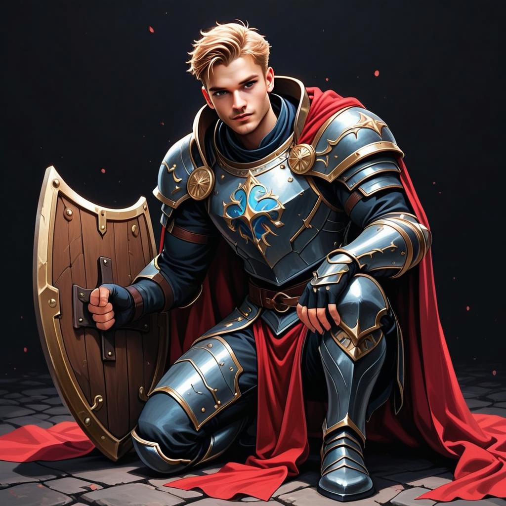 This striking image features a confident knight in shining armor, embodying a fantasy theme reminiscent of epic tales. With a majestic castle in the background and a determined expression, the character exudes strength and nobility, perfect for projects related to adventure and heroism.
