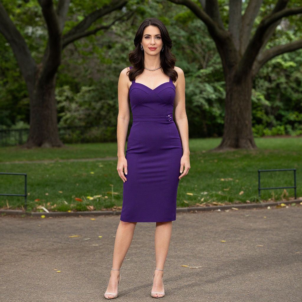 A confident woman stands outdoors in a lush park setting, wearing a fitted purple cocktail dress with a sweetheart neckline. Her dark hair is styled in soft waves, complementing her elegant and poised demeanor.