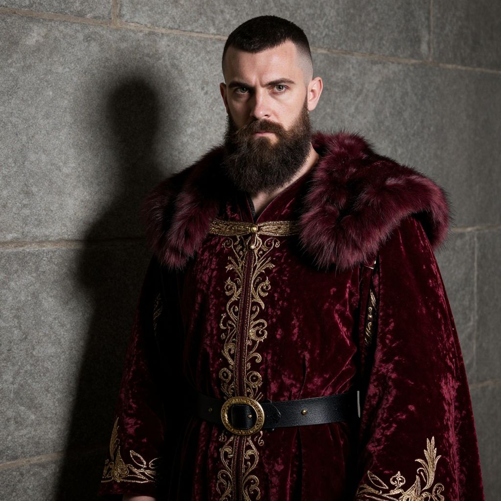A serious bearded man stands against a stone wall, dressed in an ornate medieval-style burgundy velvet robe with intricate gold embroidery and a fur-trimmed collar. The dramatic lighting highlights his intense expression and the rich textures of the fabric, evoking a regal or noble atmosphere.