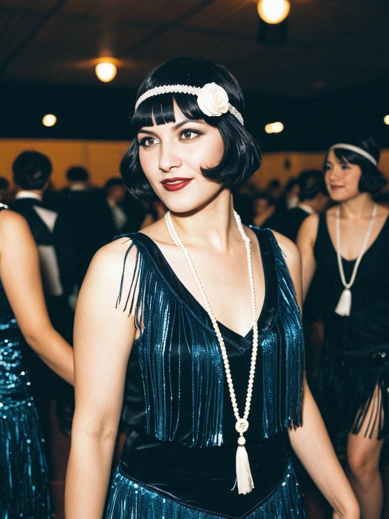 The woman is dressed in an elegant flapper dance costume, featuring a dark blue fringed dress and a long pearl necklace, embodying the iconic 1920s style. Her bobbed hair is styled with a beaded headband adorned with a white flower, perfect for the vintage cosplay festival setting.