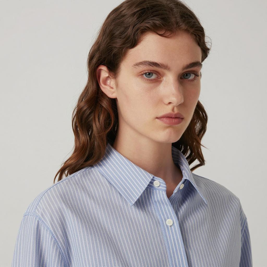 Young Woman Wearing Light Blue Striped Shirt Minimalist Portrait