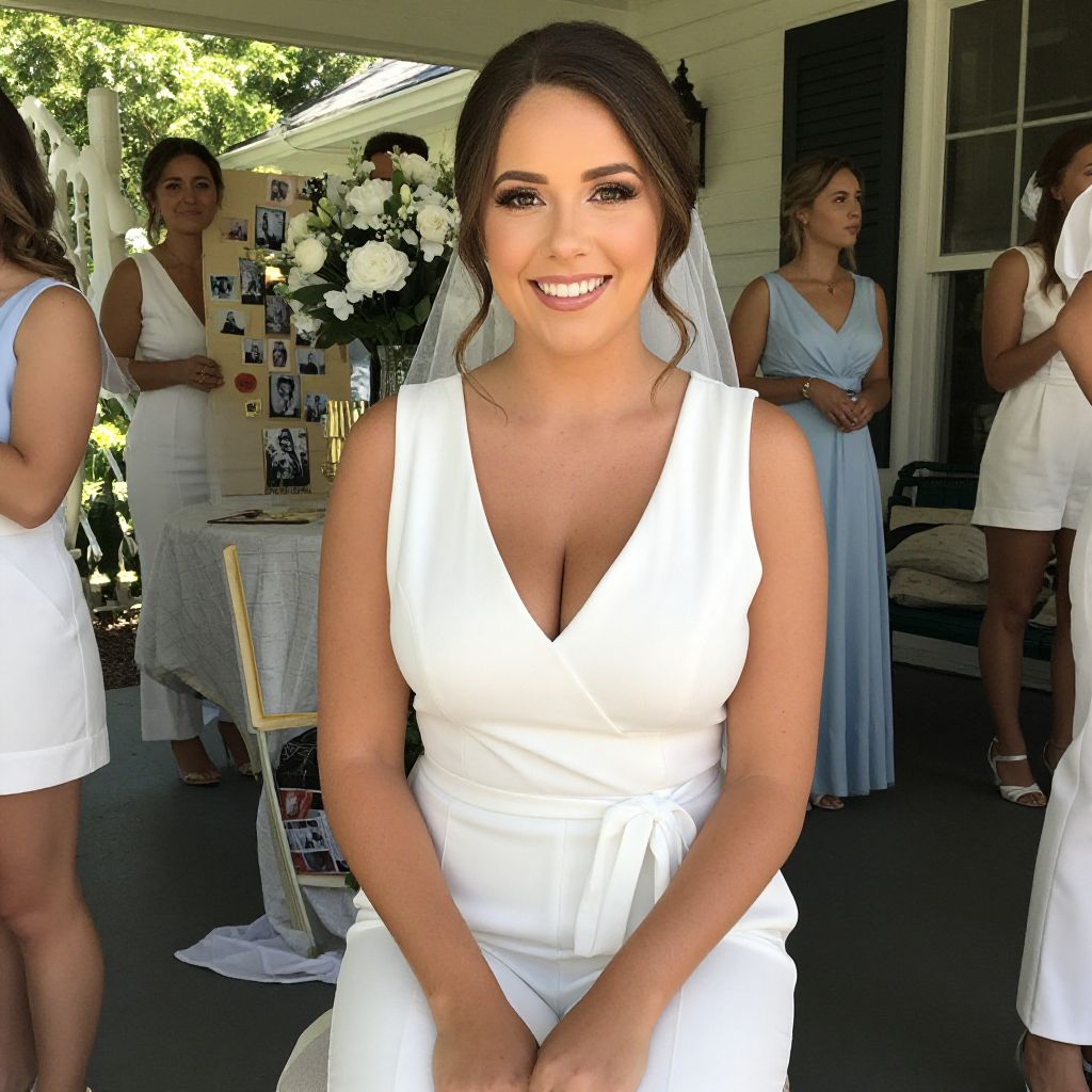 A smiling bride dressed in a stylish white sleeveless jumpsuit with a V-neckline poses gracefully, surrounded by bridesmaids in elegant dresses during a daytime wedding event. The scene captures the joyful, natural light atmosphere of a reception or bridal gathering outdoors on a porch with floral decorations.