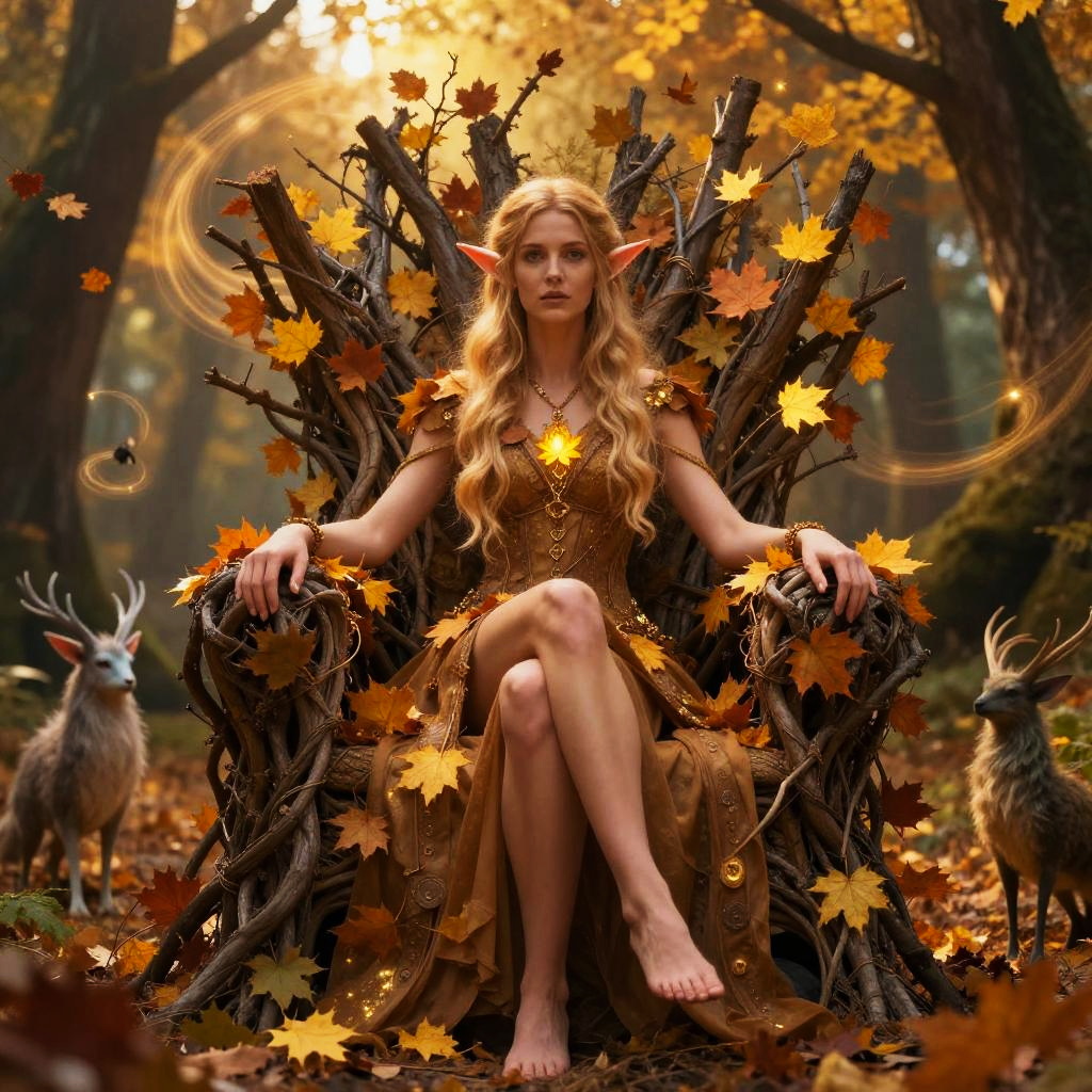 Fantasy Elf Woman Sitting on Autumn Leaf Throne in Enchanted Forest