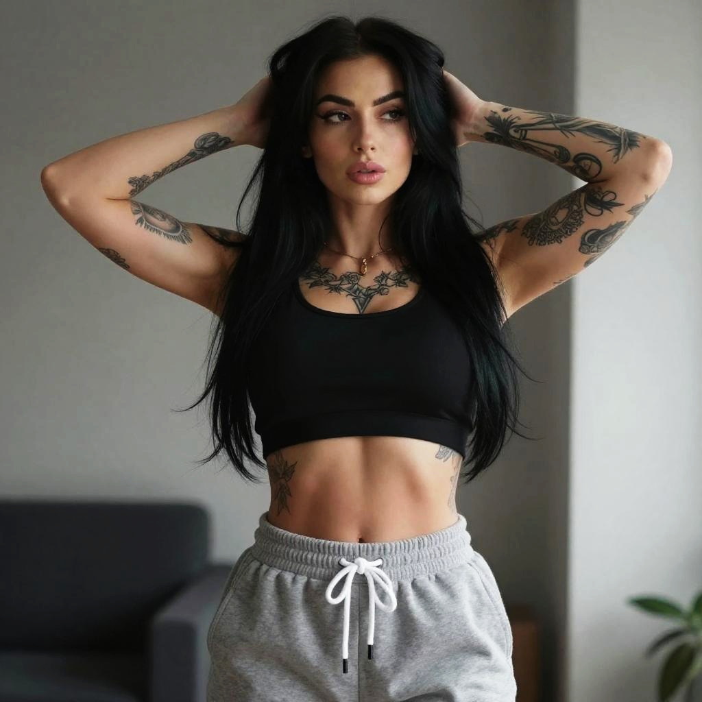 A tattooed woman with long black hair poses confidently indoors, wearing a black sports bra and grey sweatpants. Her tattoos are prominently displayed on her arms, chest, and waist, highlighting her alternative edgy style.