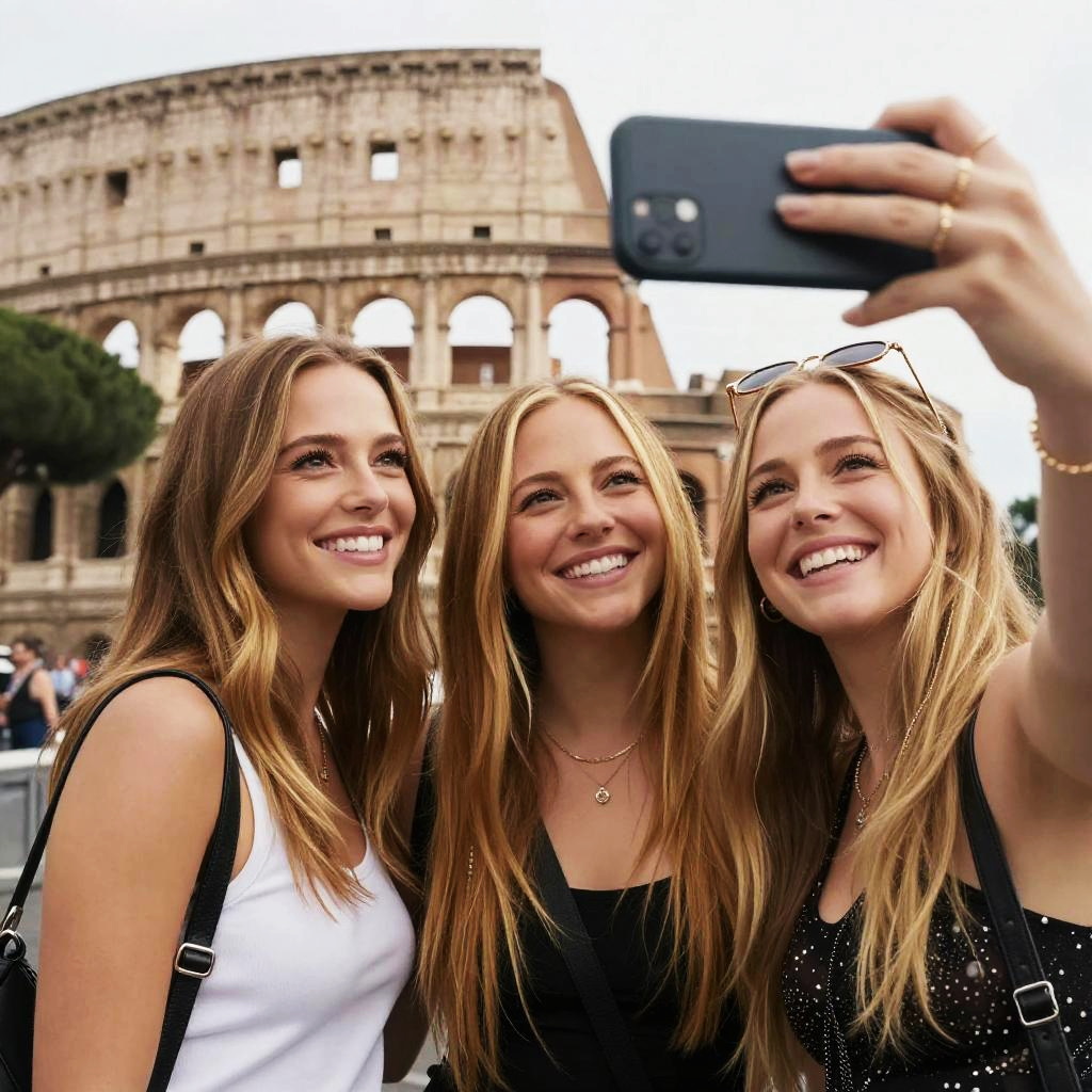 Three smiling young women take a selfie together in front of the historic Colosseum in Rome. They are dressed in casual modern attire, capturing a joyful travel moment against the iconic ancient landmark backdrop.