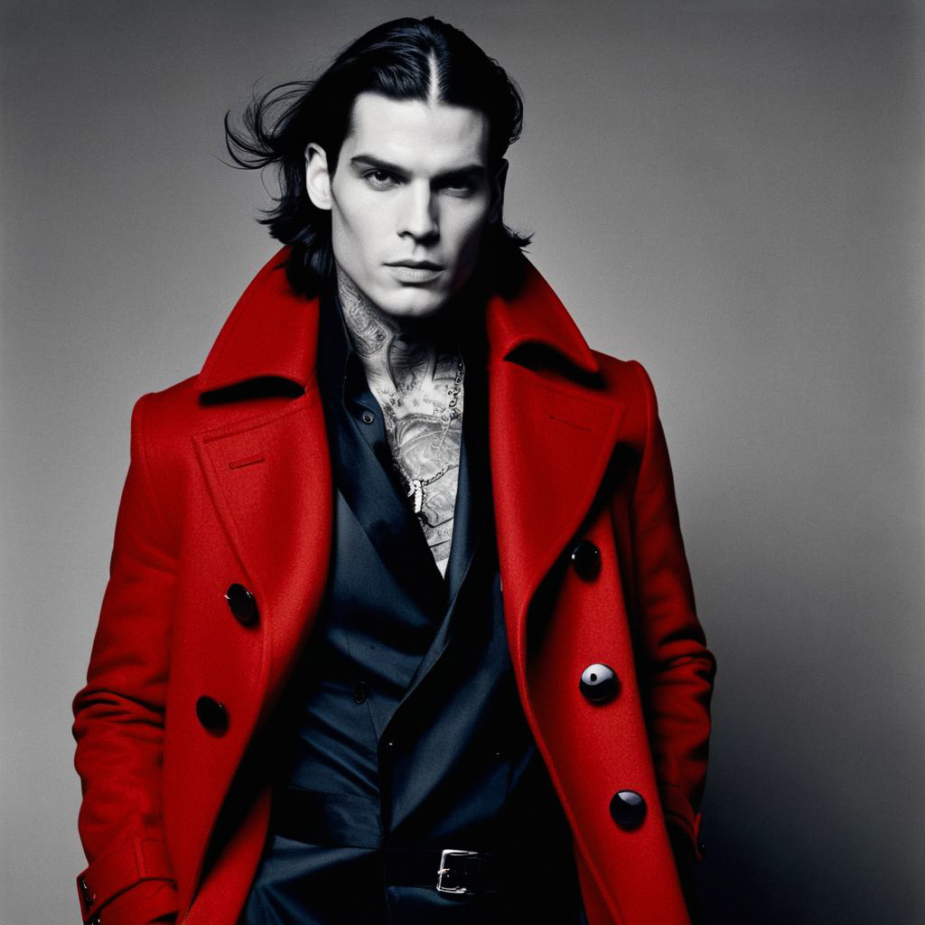 This striking image features a young man with tousled hair, showcasing a trendy denim jacket layered over a stylish sweater. The modern aesthetic and dramatic lighting give the photo a high-fashion vibe, making it suitable for editorial and promotional use.